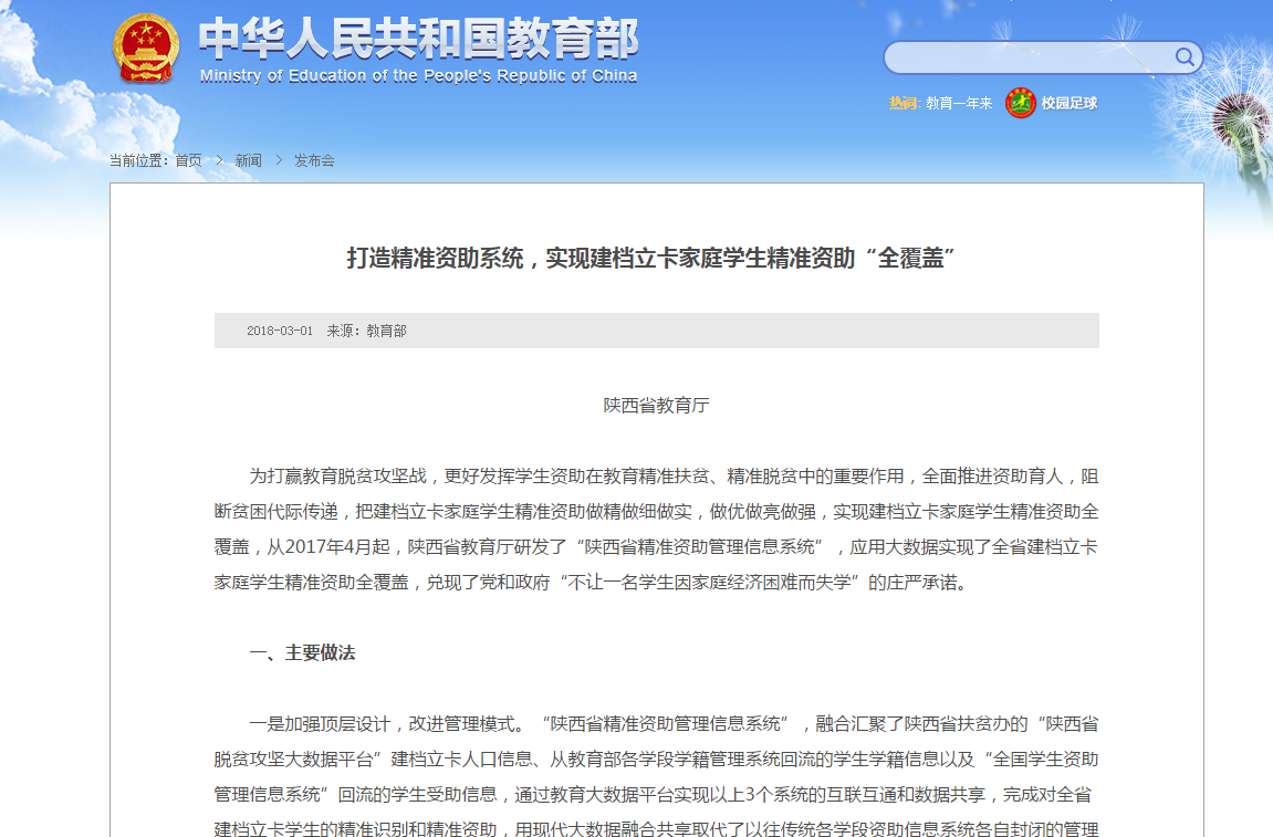 教育部網站(zhàn)報(bào)道(dào)陝西(xī)教育精準資助經驗和±∞₩(hé)精準資助大(dà)數(shù)據系統優秀案例,該系統由陝西(xī)凱銳公司開(kāi)發!♣β✔陝西(xī)省教育廳以全國(guó)教育系統資助工(€₩gōng)作(zuò)示範單位的(de)身(shēn)份,出席了(le)此次新聞發布會(huìεΩ),并面向全國(guó)新聞媒體(tǐ)宣傳陝西(xī)教育精準扶貧₽∏♦取得(de)的(de)成績。